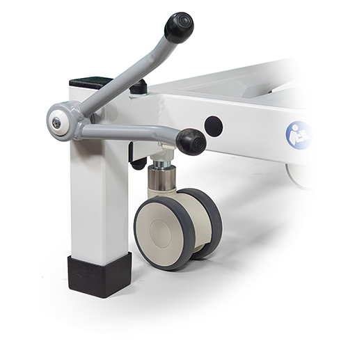 4 Fußhebel mit 2 ergonomisch angeordneten Gegenhaltern ermöglichen ein fußgesteuertes, geräuscharmes Absenken auf die Liegenfüße oder Anheben auf die Doppelrollen.